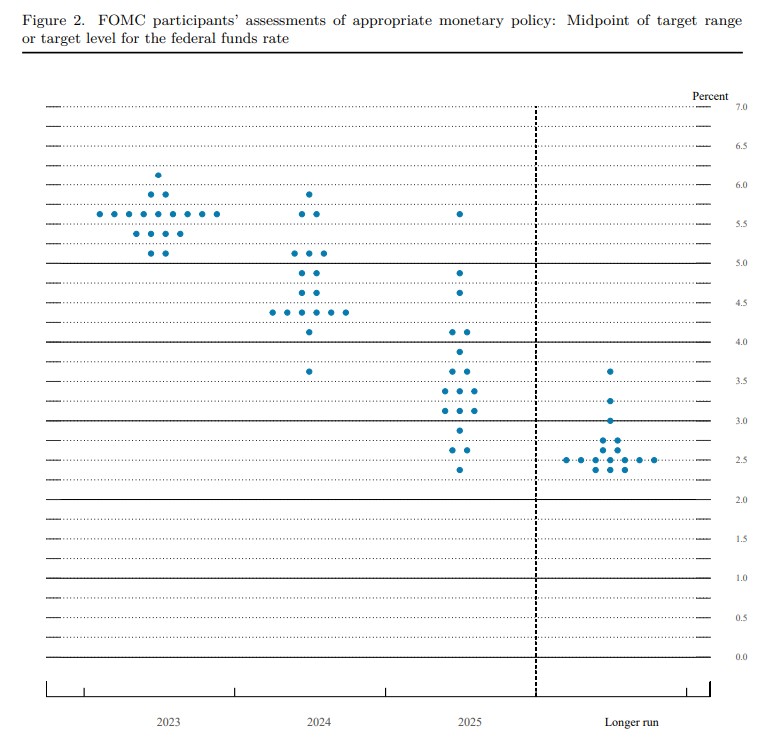 由于商场多量预期好意思联储此次会议将利率保管在5%至5.25%的区间,投资者的提防力转向了好意思联储所谓的“点阵图”预测和好意思联储主席杰罗姆·鲍威尔在新闻发布会上的说话。领先,最新的FOMC点阵图标明,三分之二好意思联储官员权衡本年利率高于5.5%这也意味着还有至少两次加息25基点,官员们将利率峰值的预期中位值晋升50个基点至5.6%。