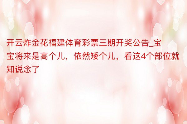 孩子的身高,受先天与后天双重身分的影响。先天的身分,即“基因遗传”,后天的身分,即“养分摄入”。许多父母老是只留意一方面的影响身分,而疏远了另一方面的身分,是以变成孩子的身高跟不上。那么,孩子长大以后,究竟是高个子,依然矮个儿?其实,通过看这4个部位,就不错判断出来了,民众不妨多去了解一下,不错赶快对照一下。