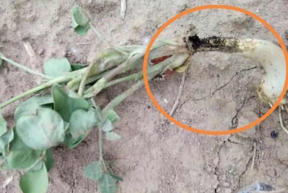 花生植株茎基部及地下根颈处,产生黄褐色水债状,后渐渐绕茎或根颈扩张形成黑褐色病斑。